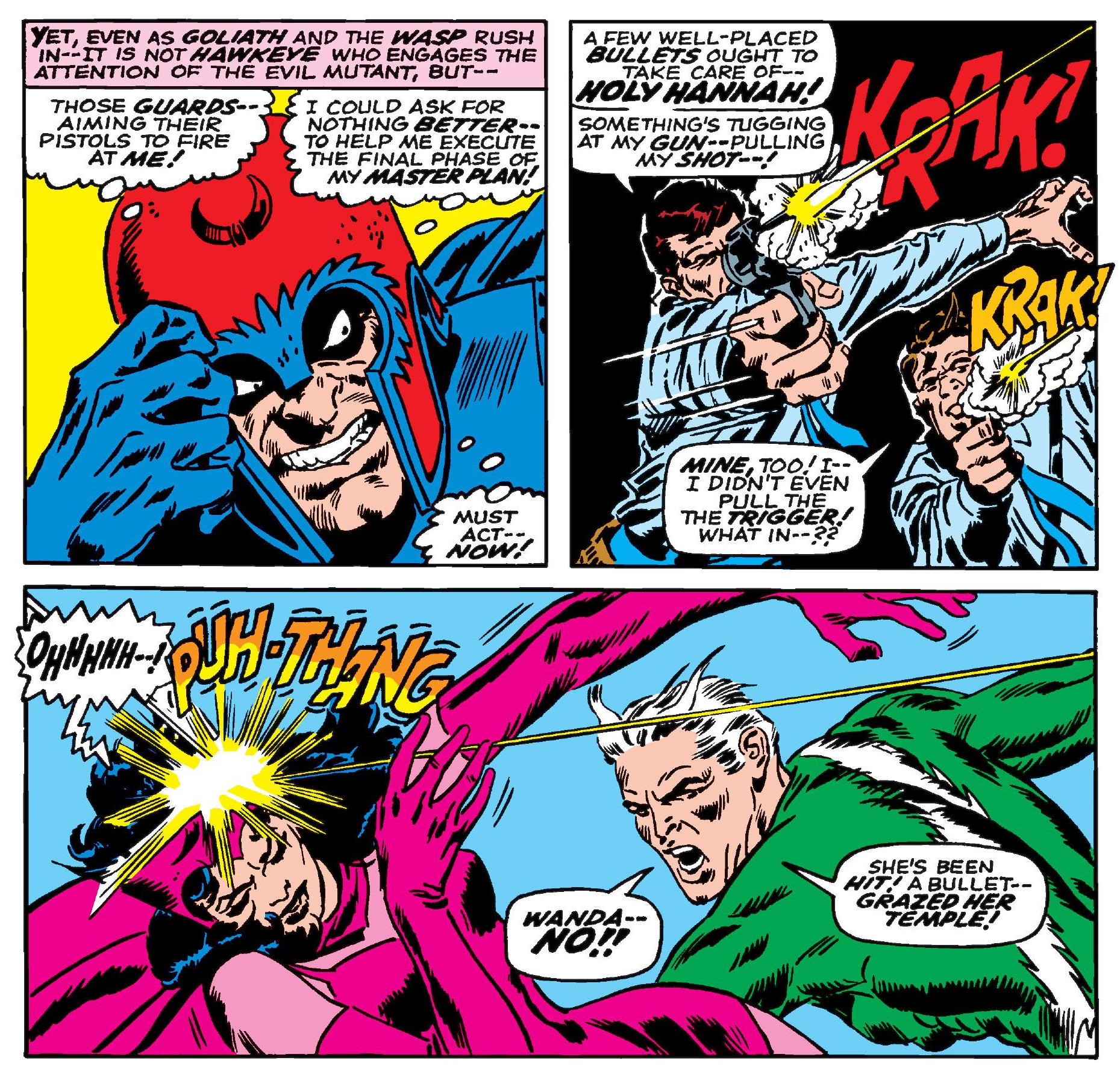 As the story informs us via a later footnote (and as we covered in greater dept in our last post), Wanda is currently suffering from a brain injury caused when a bullet grazed her temple in Avengers #49. Unfortunately, her situation won’t see any measurable improvement before the present storyline wraps up in Avengers #53.