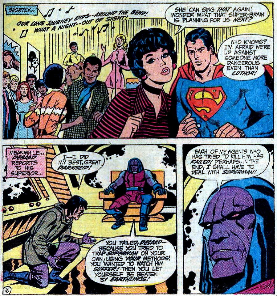 As for Dubbilex, this is only the second time we’ve seen the D.N.Alien, his only previous appearance having been a single brief scene in Jimmy Olsen #136. As far as we know, he’s never been outside the bounds of the top-secret Project, so it’s small wonder that Superman is surprised to see him at a discotheque.