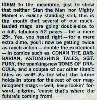 But even before the month of August came to a close, Marvel’s extra-length 25-cent comics had by and large passed into history.  By the time its “breathlessly-awaited DRACULA book” finally did come out — in November — it was as a standard-size, single-feature comic, at the new standard price of 20 cents.  (Ultimately, that meant that the “Tomb of” part of the title ended up not making nearly as much sense as it had when the book was supposed to be a black-and-white anthology, or even a 48-pager with room for an extra feature or two — though “Tomb of Dracula” was probably still easier to trademark than the single name “Dracula”, or even “Count Dracula”, would have been,)