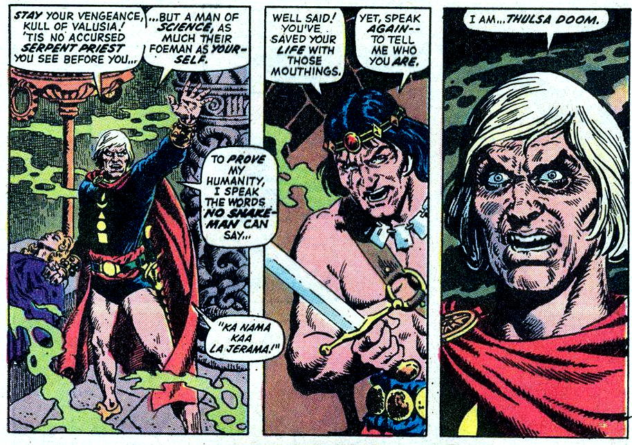 Thulsa Doom’s “demise” was rather reminiscent of the conclusion to the early Hulk serial in Tales to Astonish chronicling his initial long-drawn out encounter with the Leader, begun by Ditko on art, continued by Kirby and finally concluded by Bob Powell in a sequence in which the Leader obtains a globe which will give him all the wisdom in the universe but it proves to be far more than even the Leader’s gamma-mutated big brain can handle and he falls down dead — well, he did get better much later, unsurprisingly (I first read the entire epic in a Fireside Books collection published in 1978).