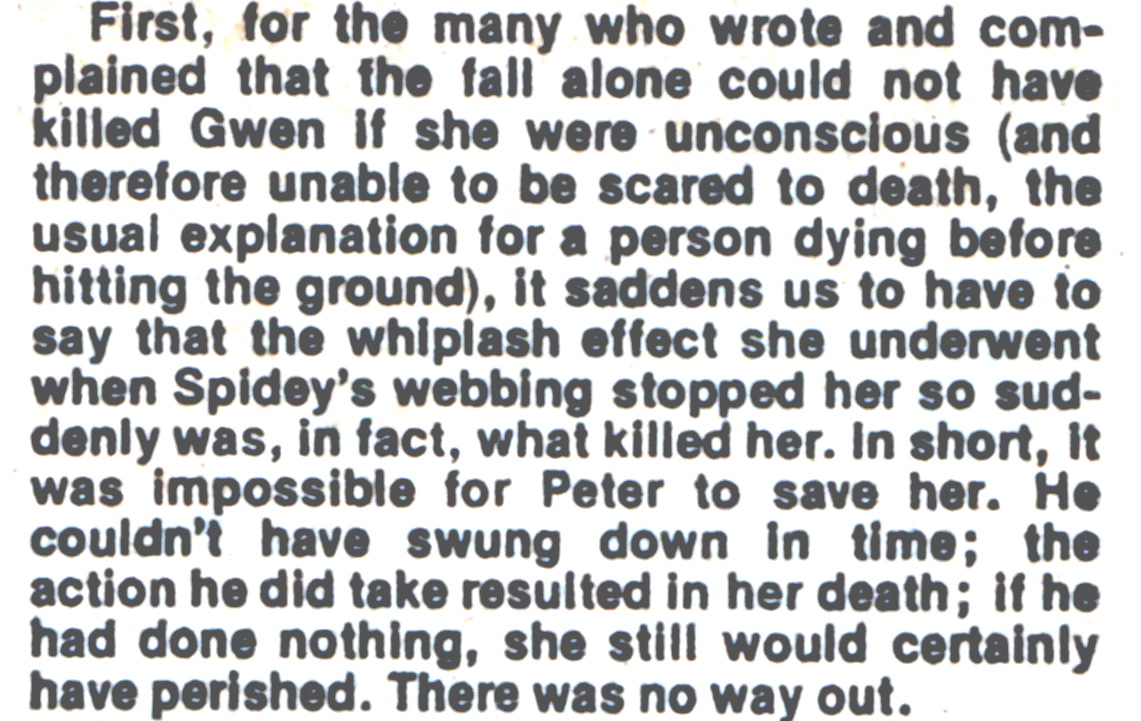 Honestly, since the whole point of the story was that she lived, I didn’t feel I needed to worry overmuch about exactly what killed her in the ongoing continuity.  “Shock of the fall” was much easier to skip past than “Spider-Man snapped her neck trying to save her.”  I always thought the latter was unnecessarily cruel.  One more way comic books were becoming more brutal.