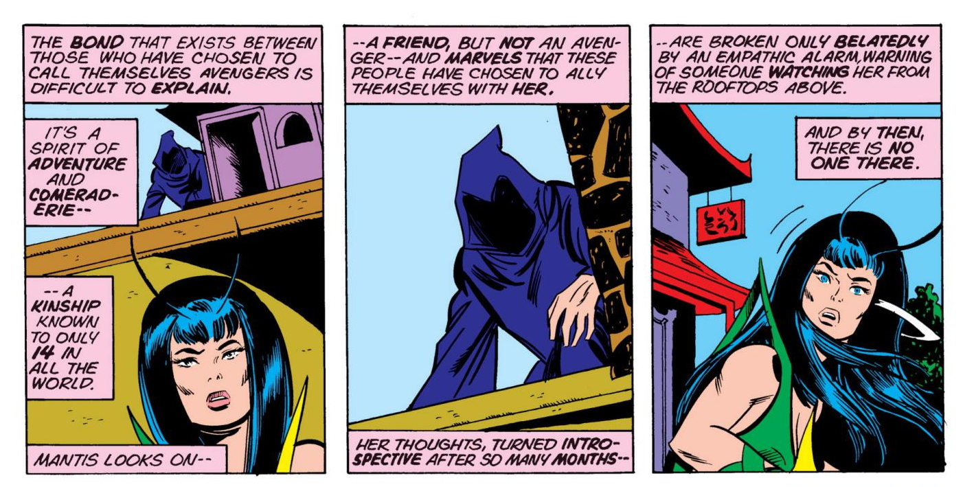I don’t know about you, but even in 1974, my younger self was pretty sure that Marvel wasn’t going to permanently off a star character like Iron Man or Thor in a random issue of Avengers. Mantis, on the other hand… While it seemed unlikely that writer Steve Englehart would wrap up his ongoing “Celestial Madonna” saga with such finality this quickly, it was at least possible. After all, “this one” had joined the cast of the series at the very same time as the Swordsman, and now, with him gone…