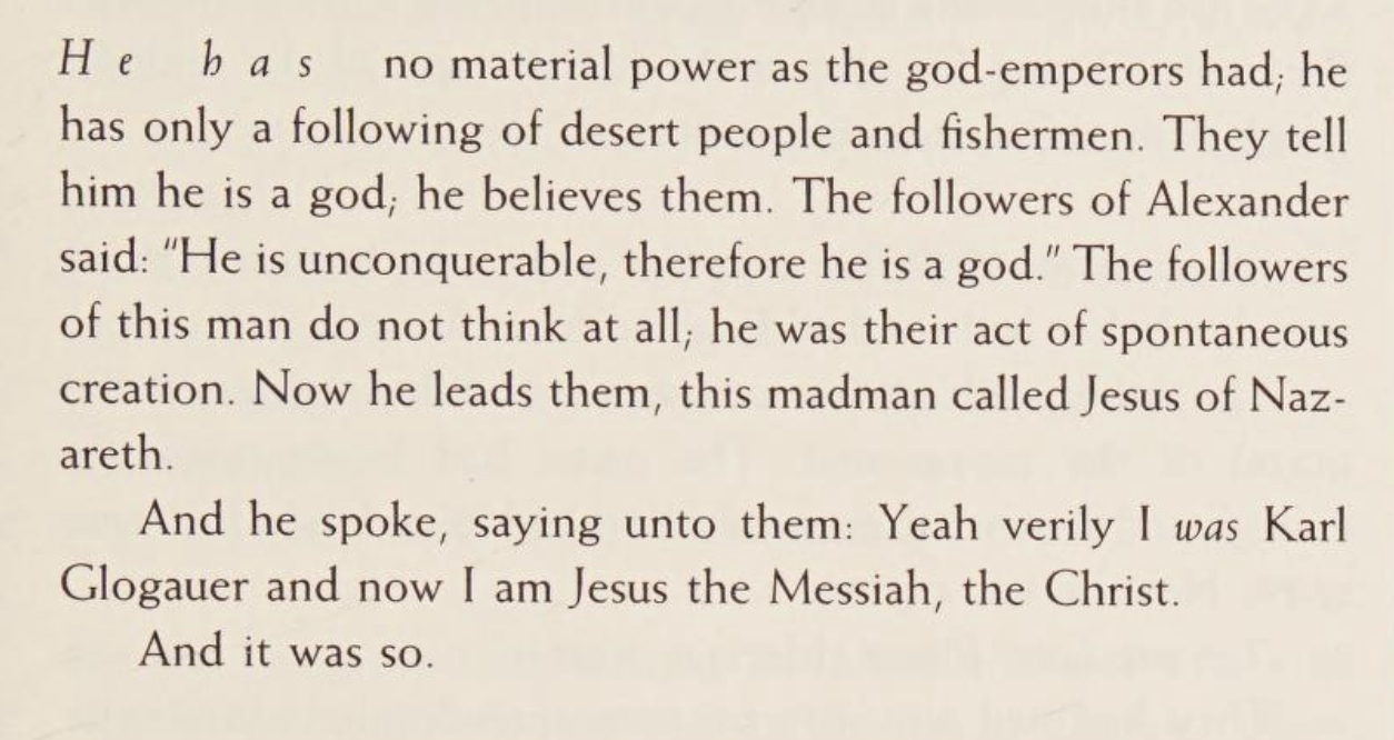 Returning to the narrative, we’re informed that “the madman” — i.e., Karl Glogauer — wandered out of the wilderness and into an unnamed town, where he asked everyone (mostly using words they couldn’t understand) where he could find “Jesus” or “Nazareth”. Eventually, some Roman soldiers pointed him in the proper direction…